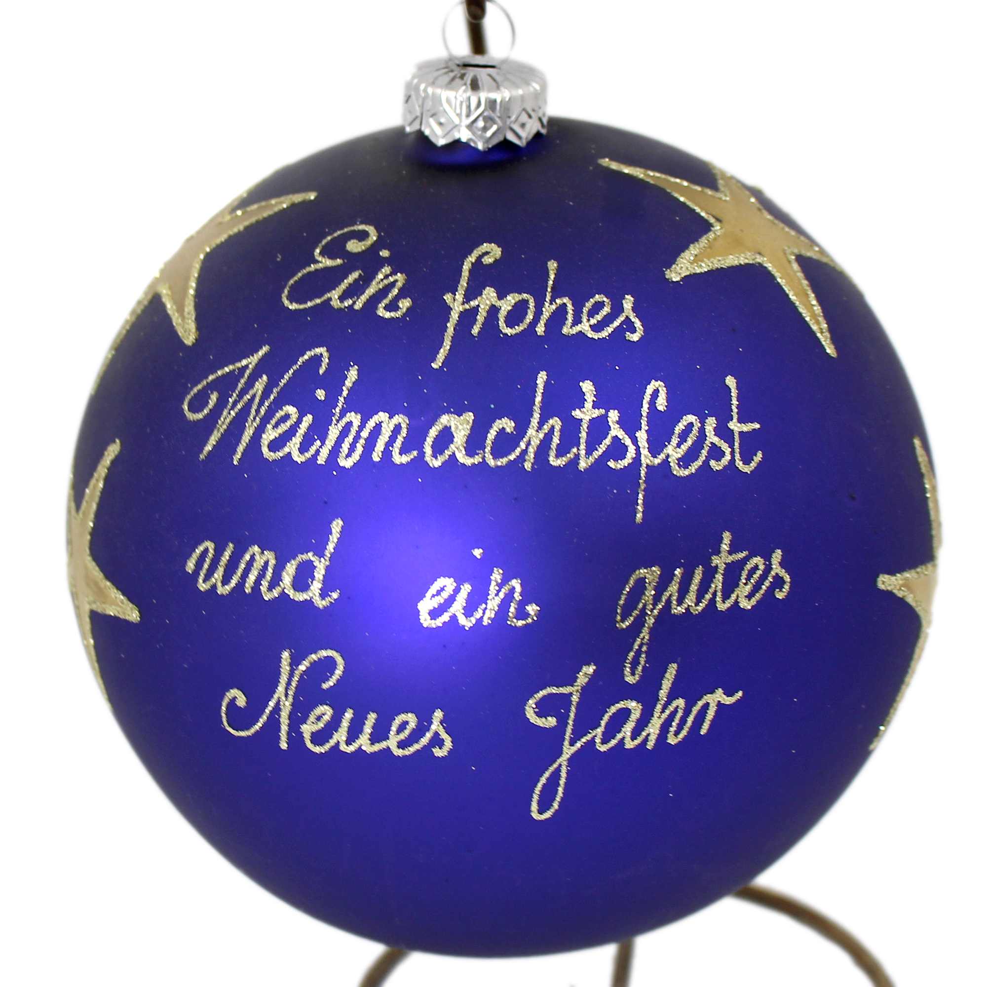 Verschenken Sie Ihren Liebsten diese große Kugel samt Weihnachtsgrüßen "Ein frohes Weihnachtsfest und ein gutes Neues Jahr", mit der Hand mit Goldbuchstaben geschrieben. Die Glaskugel ist ein Unikat und qualitativ hochwertiges Produkt.
