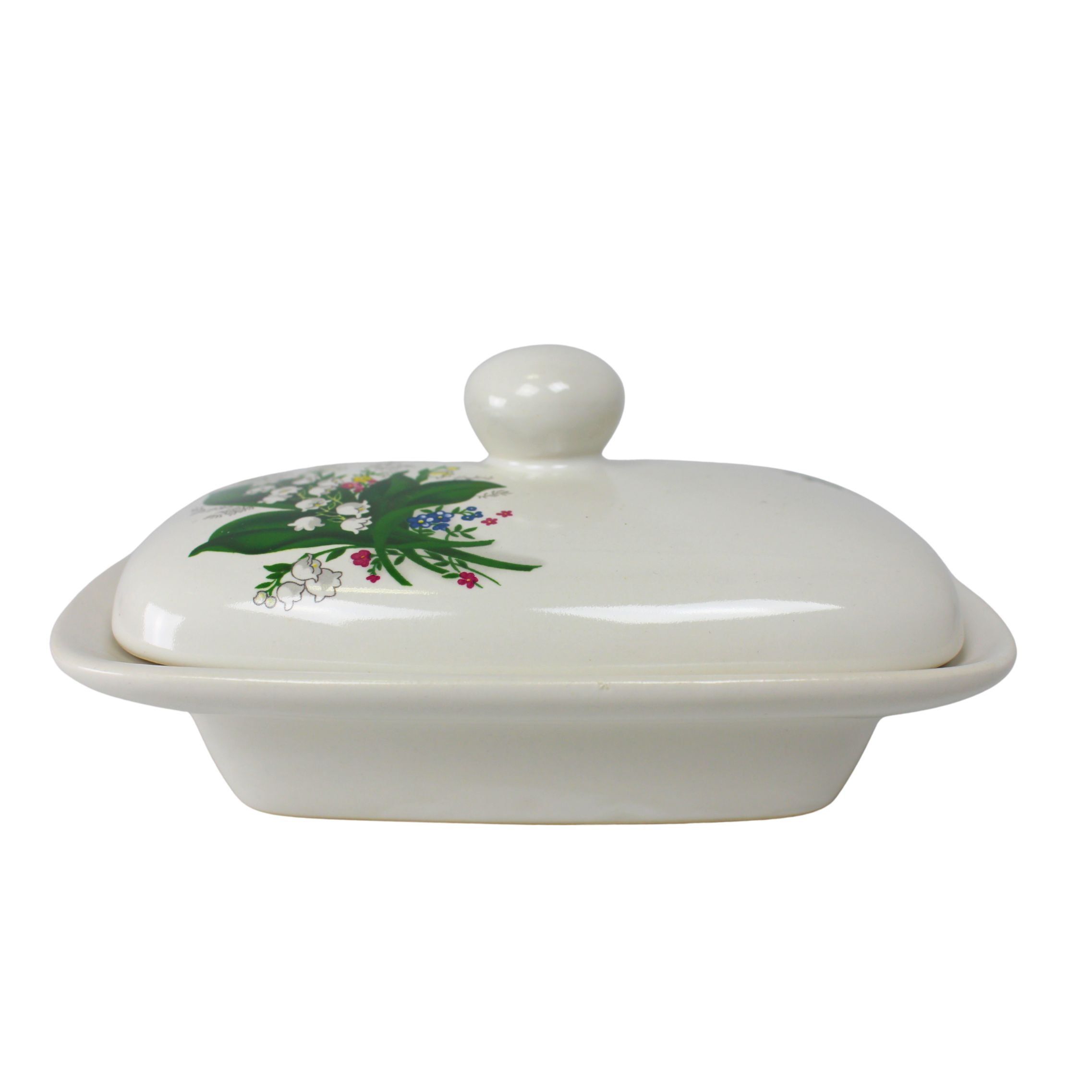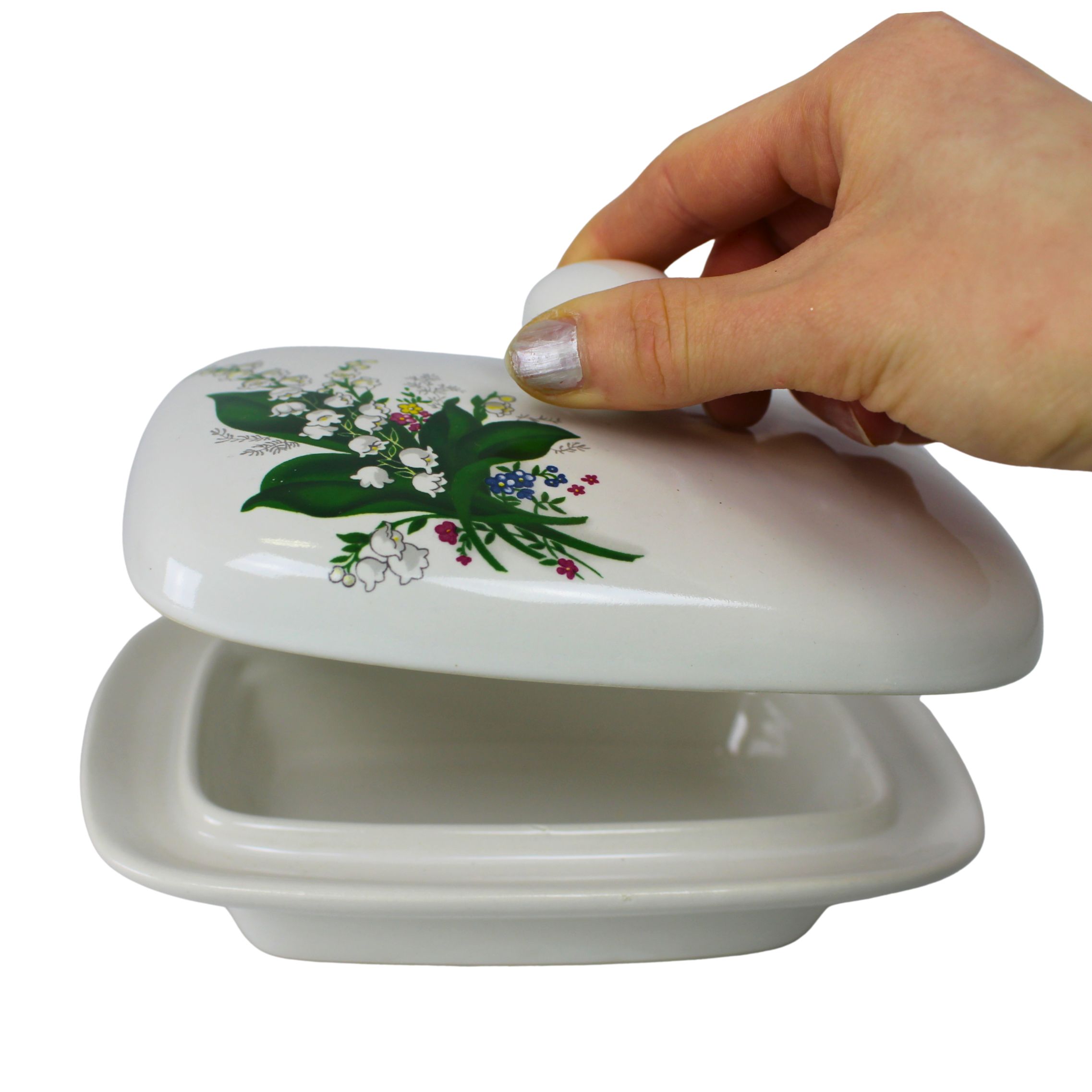Maiglöckchen Dank der neutralen weißen Farbgebung lässt sich die Keramik-Butterdose wunderbar mit anderen Geschirrteilen kombinieren. Ob rustikale Holzelemente, modernes Porzellan oder farbenfrohe Akzente – diese Butterdose fügt sich mühelos in deine Tischdekoration ein. Das Maiglöckchenmotiv setzt dabei einen sanften, natürlichen Kontrast und sorgt für eine freundliche Atmosphäre.