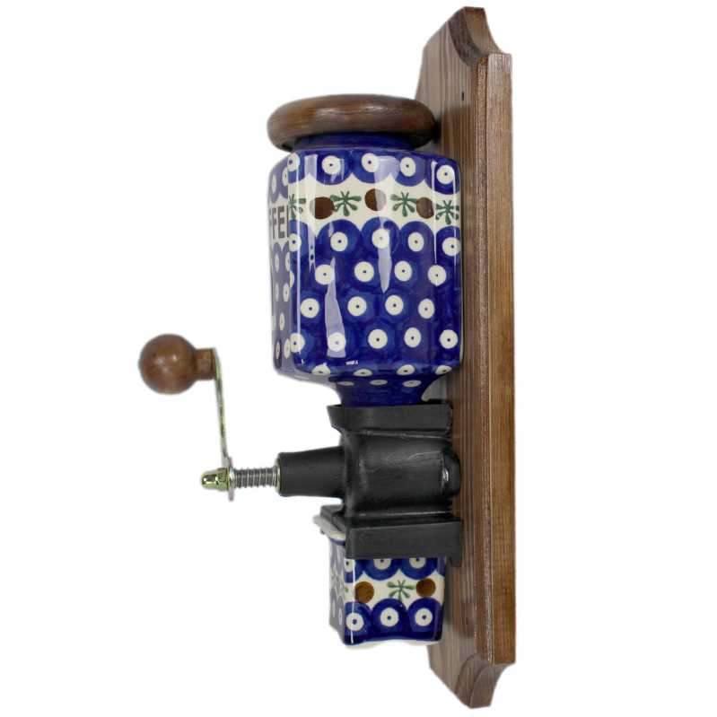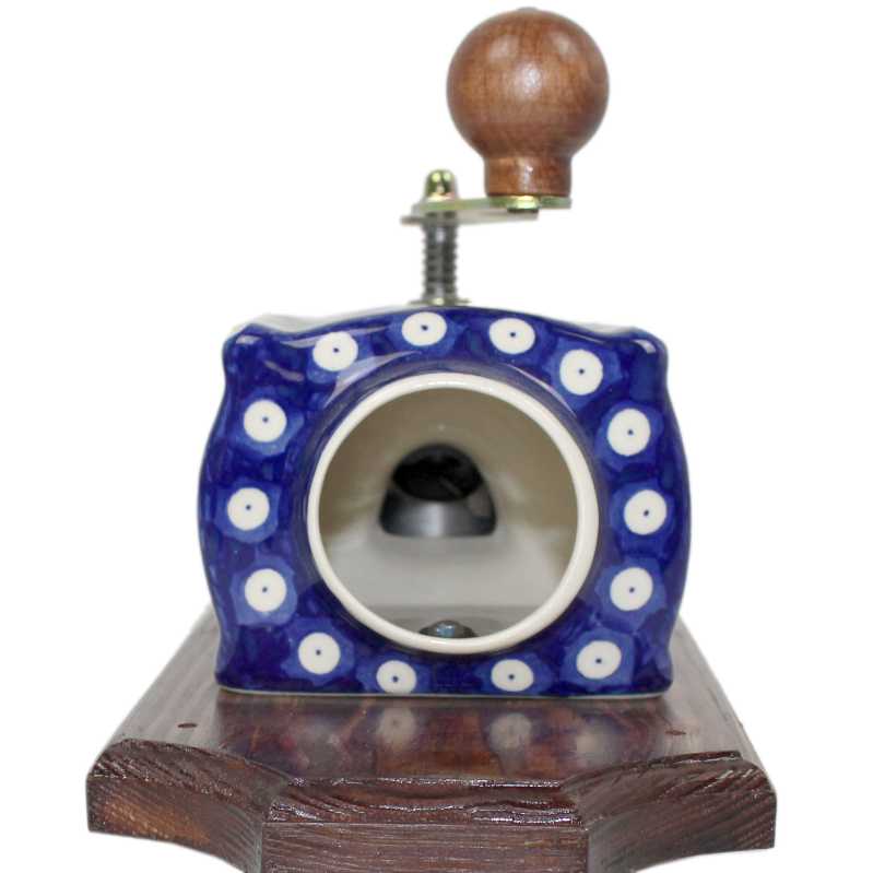 Die Kaffeemühle ist im schönen ländlichen Stil gehalten. Sie ist ein stimmungsvolles und dekorierendes Element jeder Landküche. Weiße hochglanz lasierte Keramik wird hier mit Bunzlauer Traditionsmuster verziert. Das Motiv auf der Mühle kann sich etwas von unserem Foto unterscheiden.