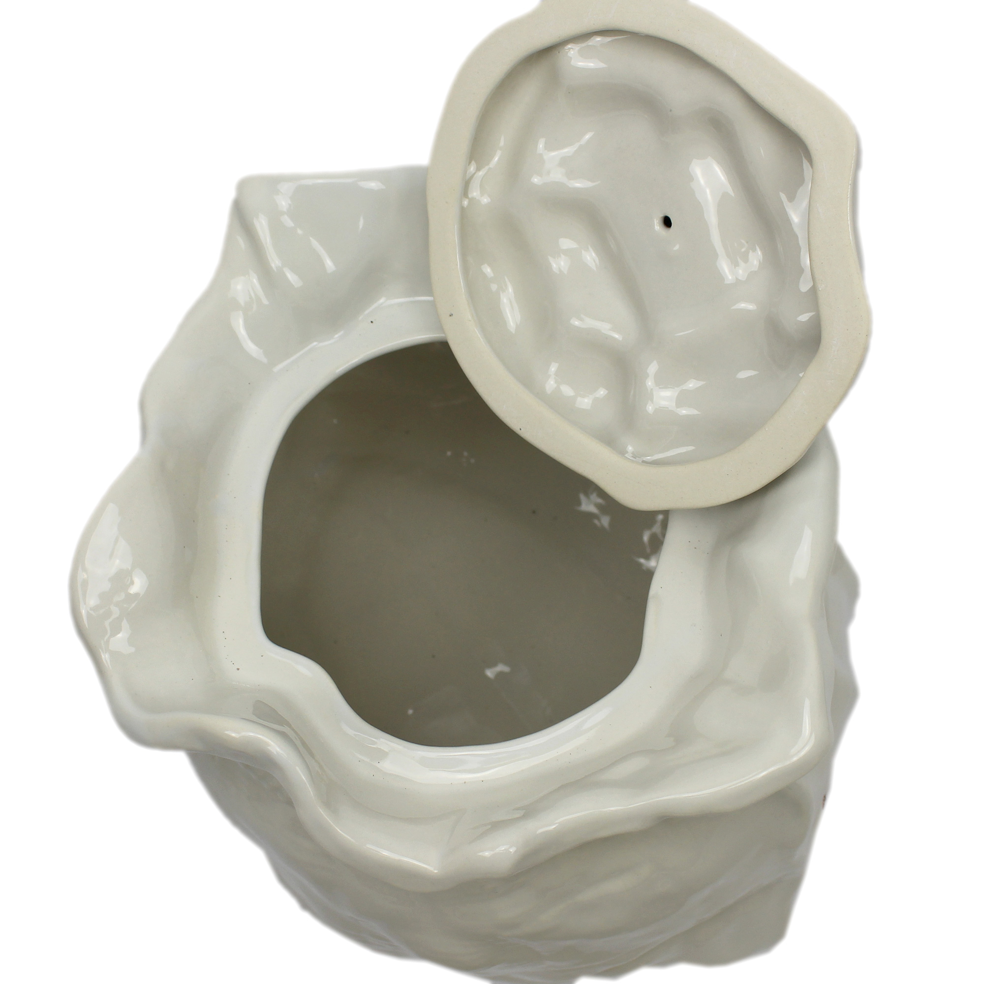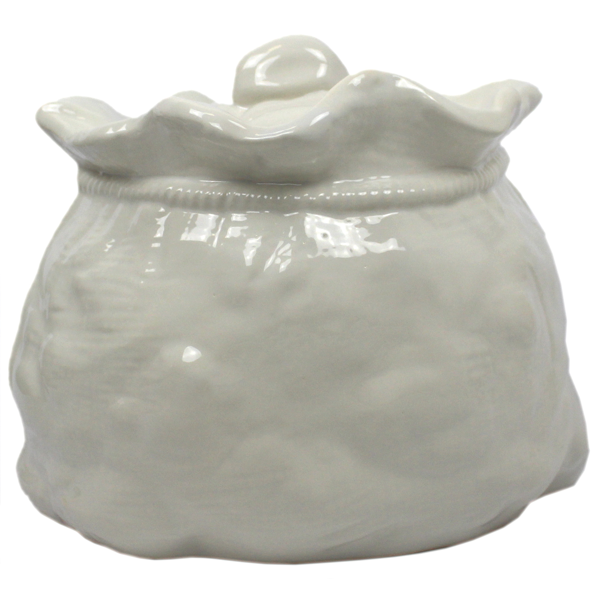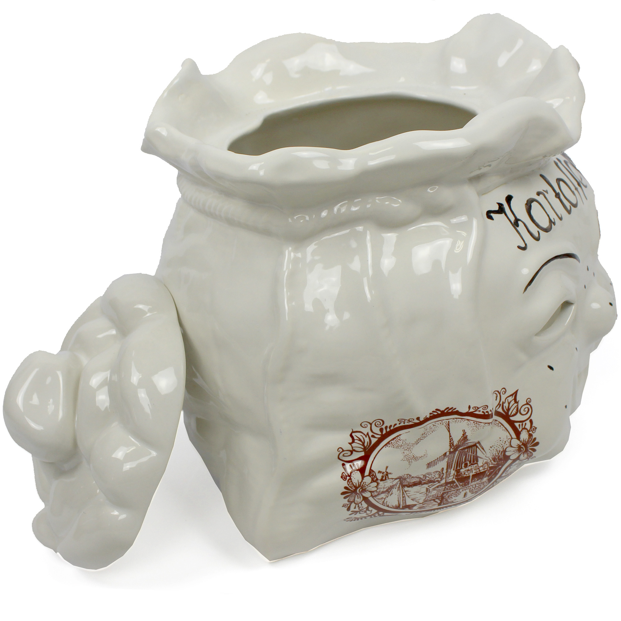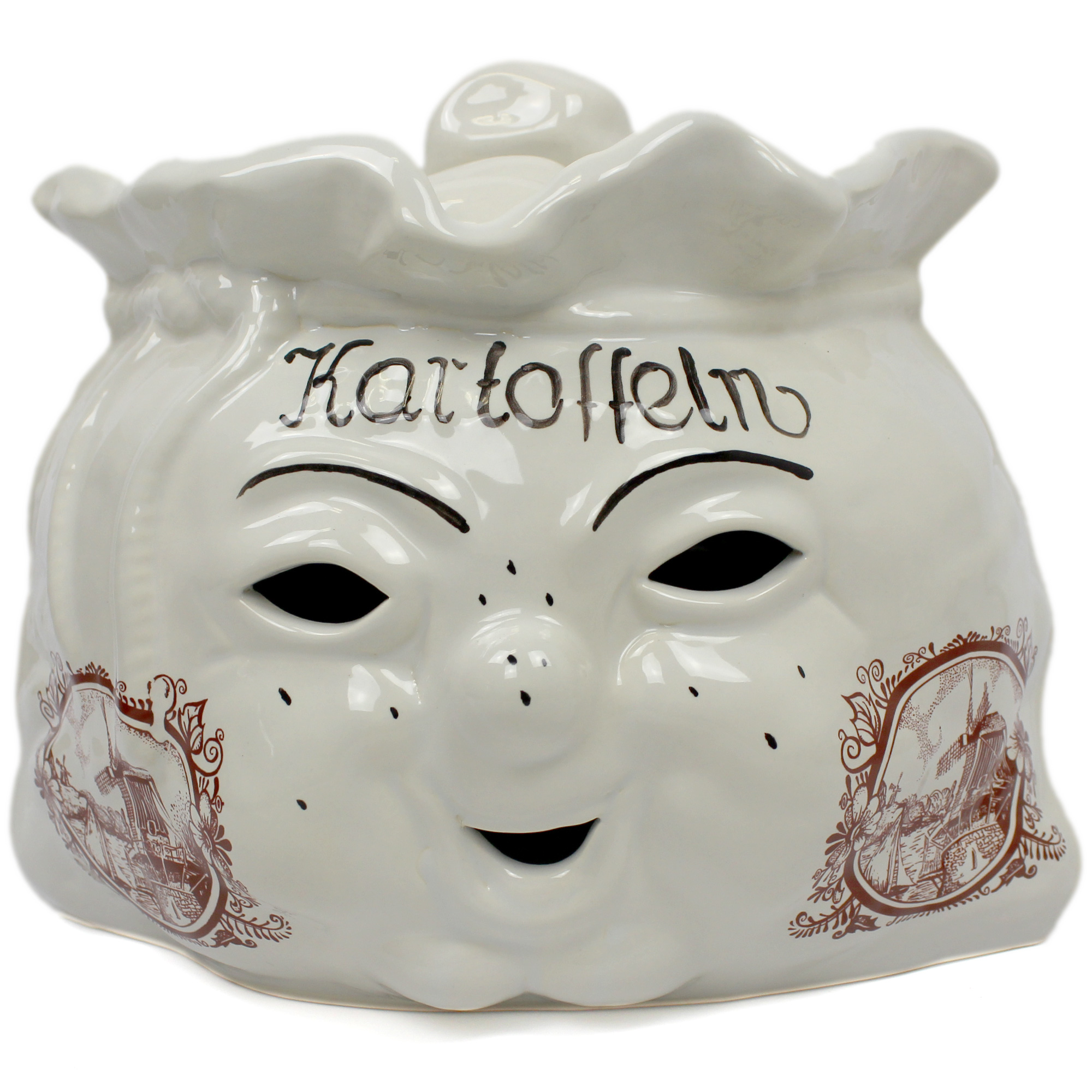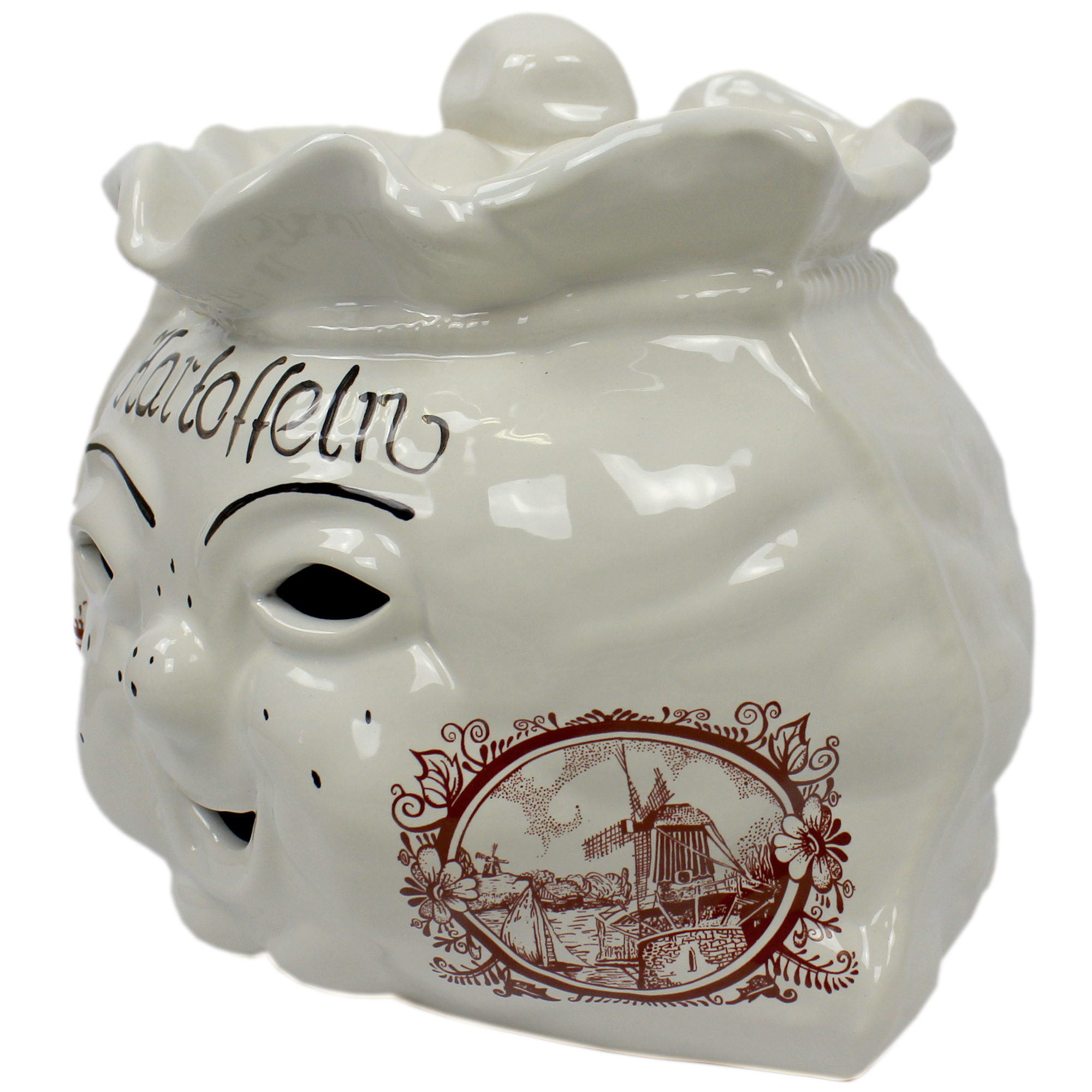 Der aus Keramik als Sack geformte Topf ist im schönen ländlichen Stil gehalten. Er ist ein stimmungsvolles und dekorierendes Element jeder Landküche. Ecrue und braune hochglanz lasierte Keramik wird hier mit Windmühle in Braun verziert. Das Motiv auf dem Topf kann sich etwas von unserem Foto unterscheiden. Der per Hand gemalte Schriftzug "Kartoffeln" gibt gleich den Inhalt bekannt und die Löcher im Topf lassen die Kartoffeln atmen und dadurch sie gut aufbewahren.