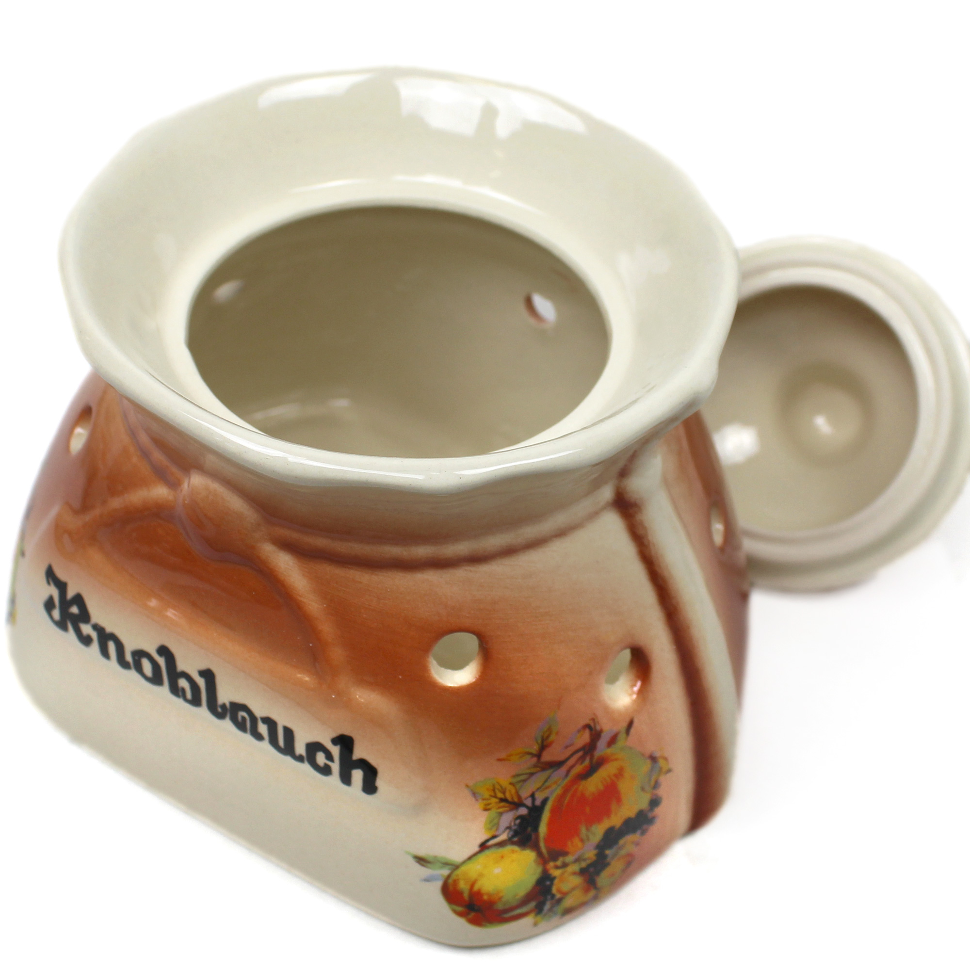 praktischer Knoblauchtopf, sackförmiger Behälter für die Aufbewahrung von Knoblauchzwiebeln, einfach zu handhaben durch den Griff am Deckel, atmungsaktiv durch Lüftungslöcher