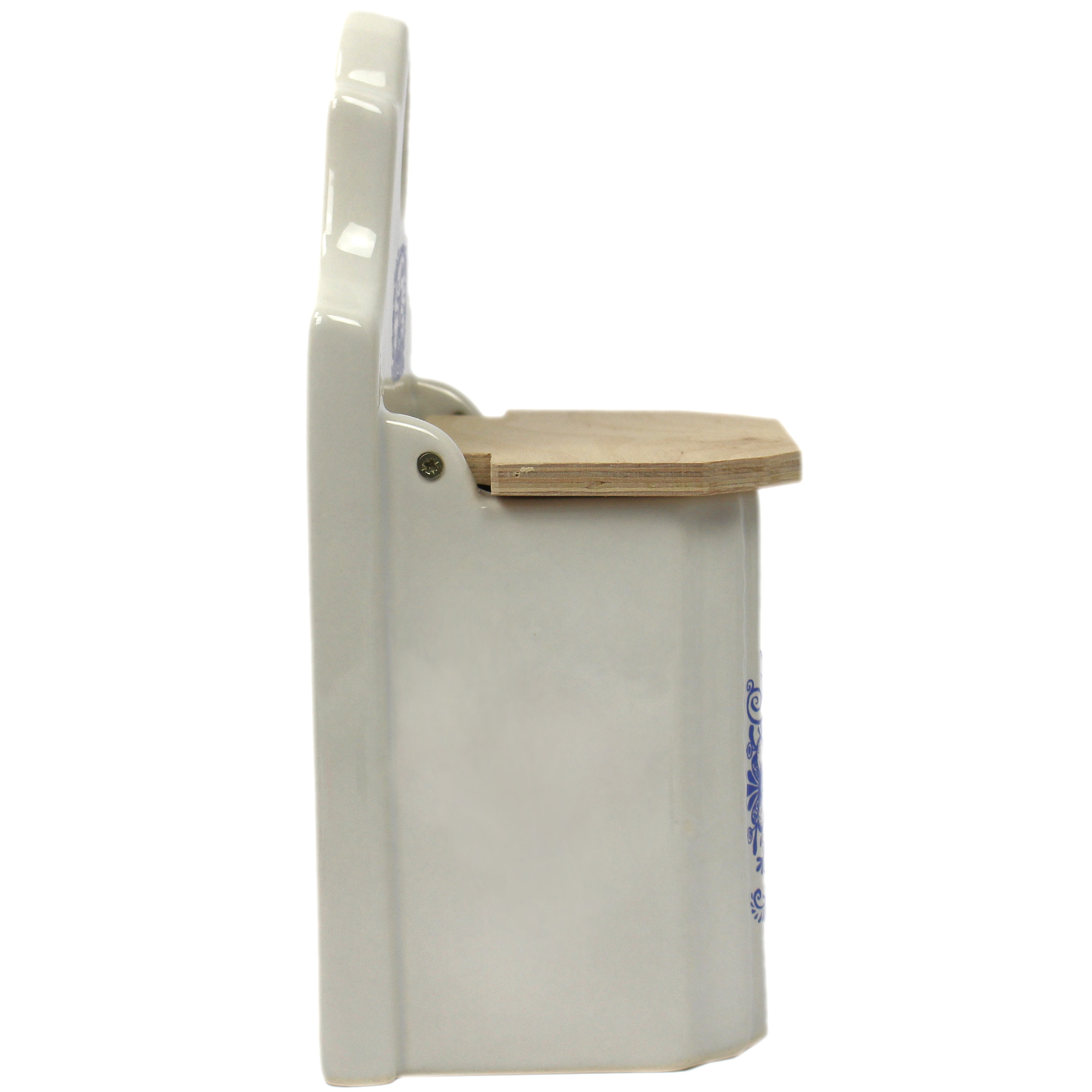 Die Vorratsdose, wie aus Omas Zeiten, ist platzsparend anhängbar und in der rechteckigen Form können Vorräte bis zu 1 Liter aufbewahrt werden. Im schönen ländlichen Stil gehalten, aus weißer Keramik, Hochglanz glasiert mit dekorativen Windmühle in Blau verziert. Auf der Rückseite ist der Wandbehälter erhöht und mit einer Öffnung versehen, so kann die Aufbewahrungsdose sicher aufgehangen werden. Die Holzklappe auf dem Porzellanbehälter verschließt die Inhaltfläche.