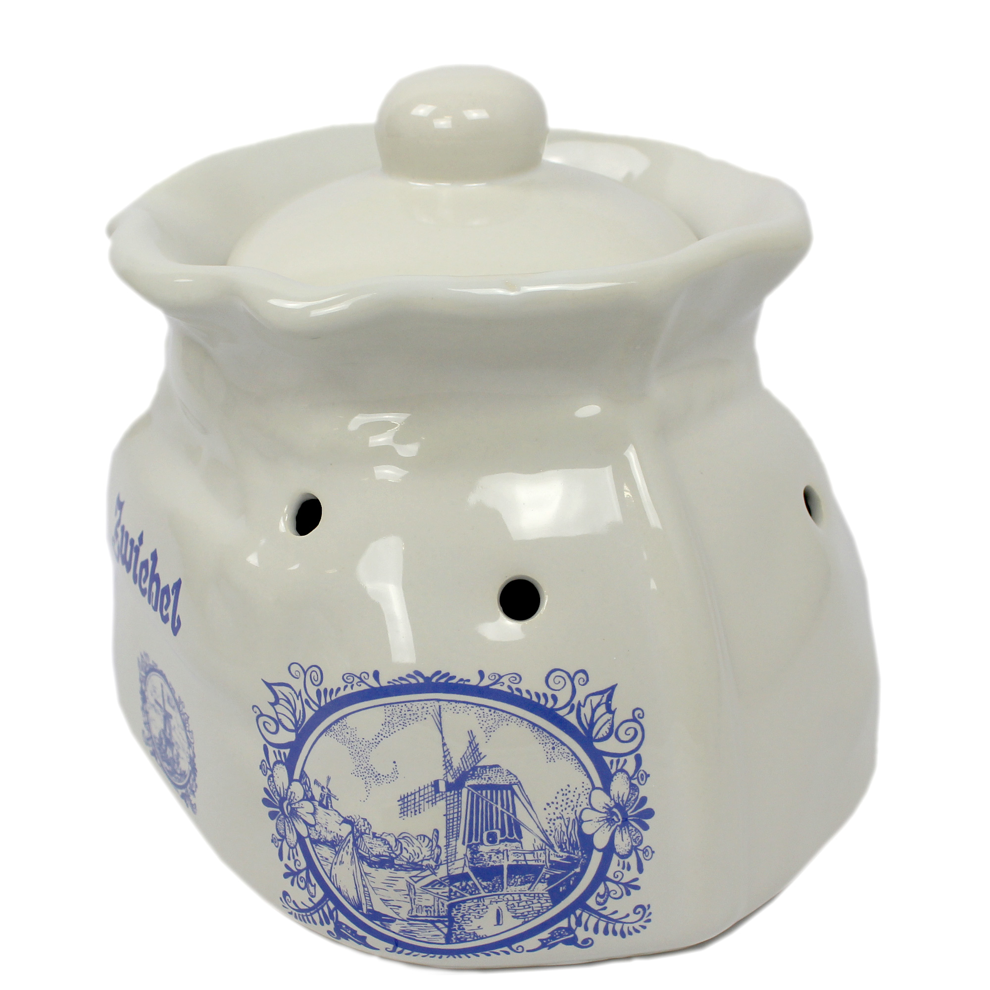 Vorratstopf für Zwiebeln verziert mit Windmühle in Blau